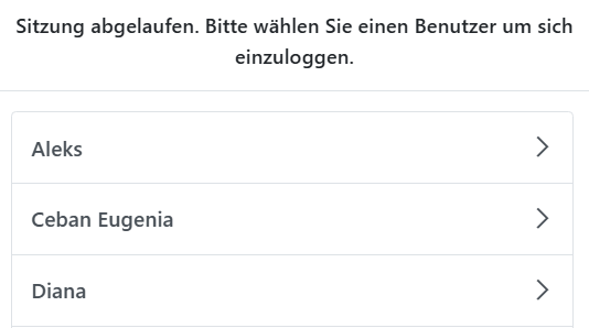 Wenn innerhalb von 15 Sekunden keine Benutzeraktivität erfolgt, meldet das System den Benutzer automatisch ab, und ein neues Login-Fenster wird angezeigt, in dem ein Benutzer ausgewählt und erneut im System angemeldet werden kann.