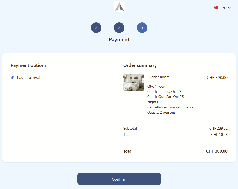 Clicking the Confirm button will redirect a guest to the next step.