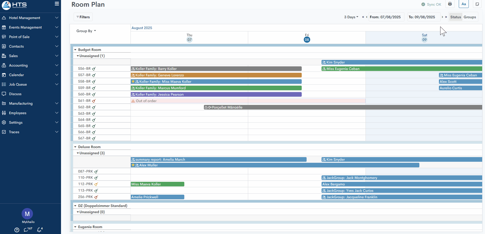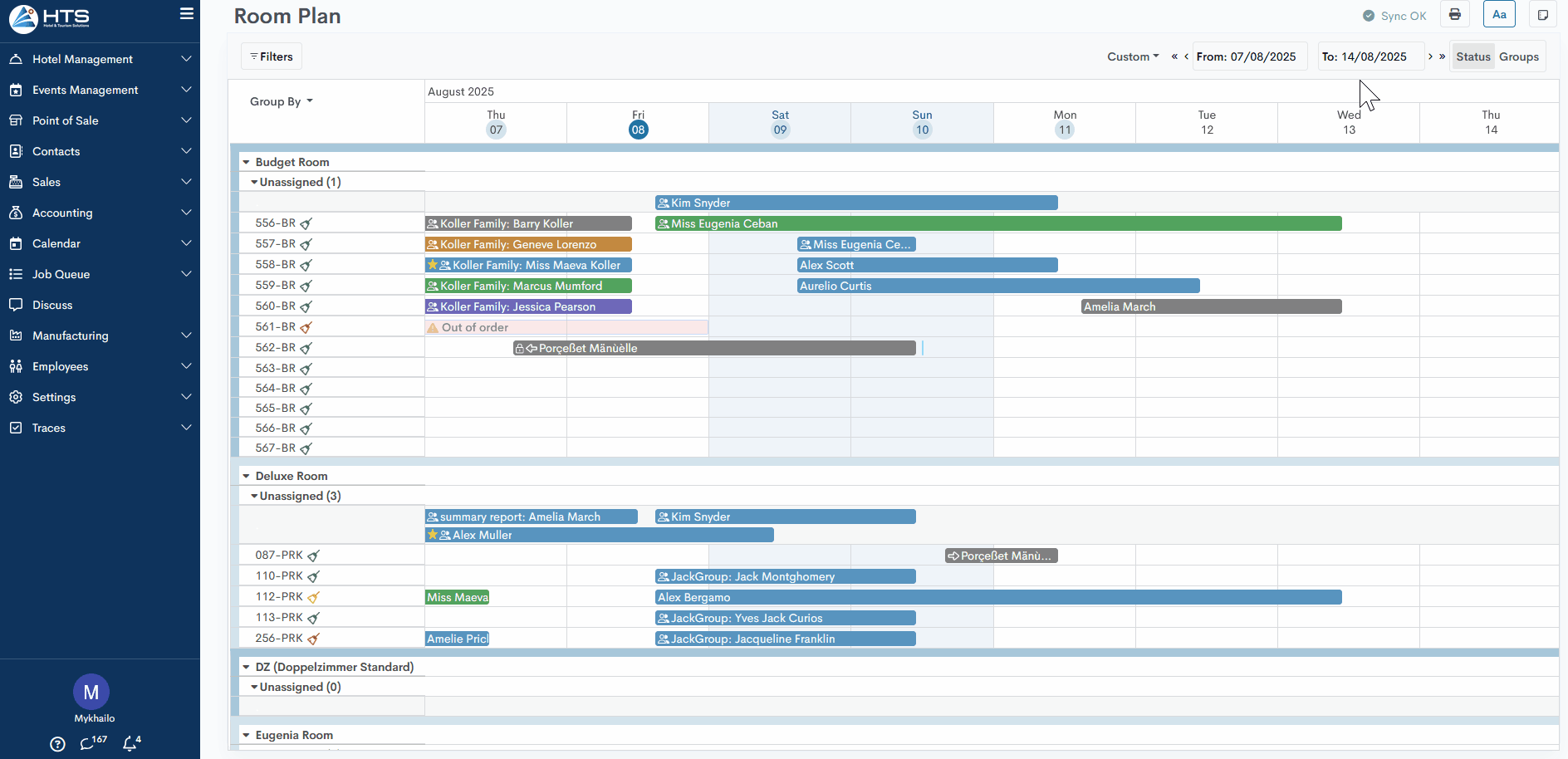 The default date range option is Week, and the system displays the room plan starting from yesterday and covering the next 7 days.