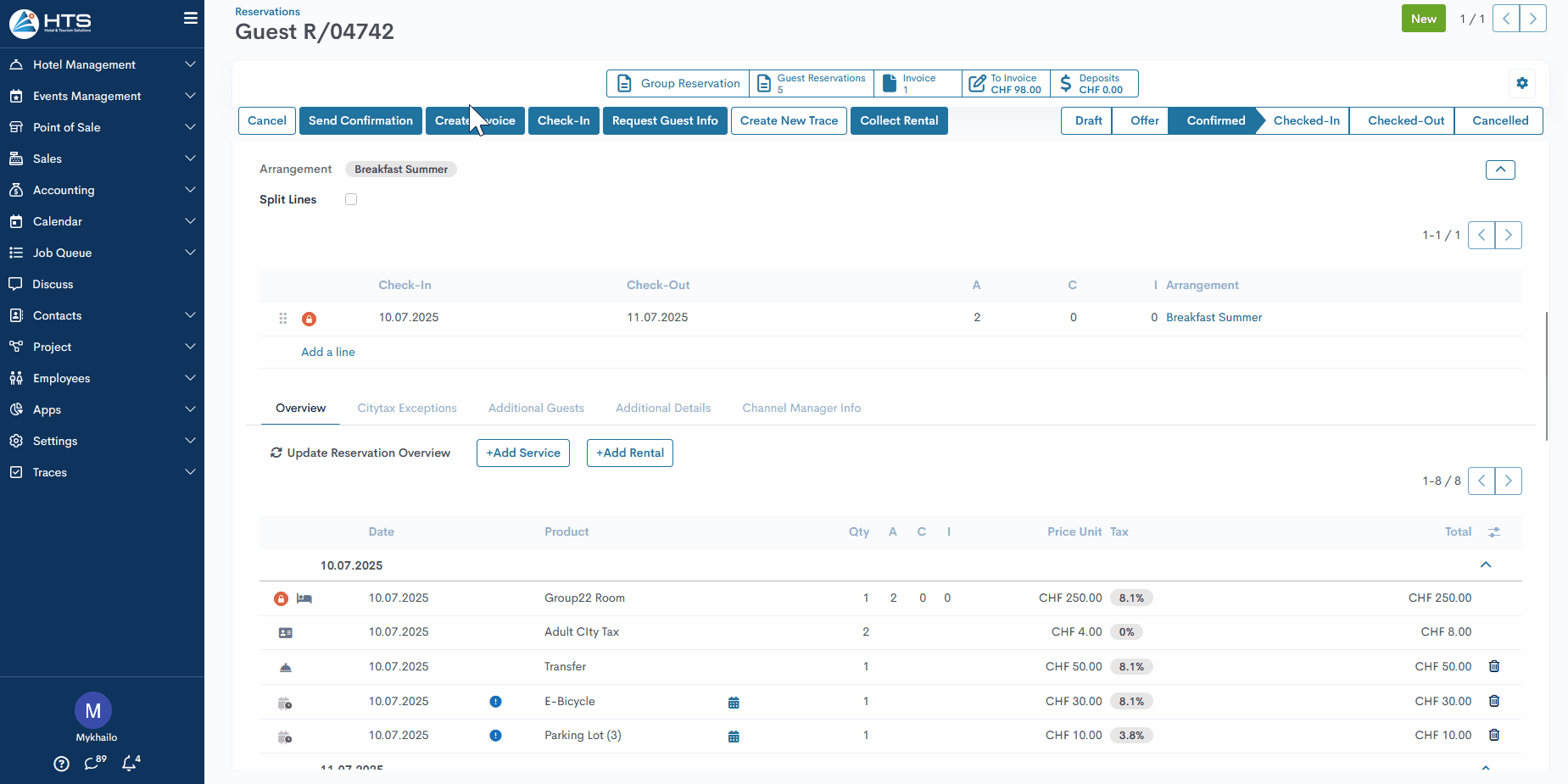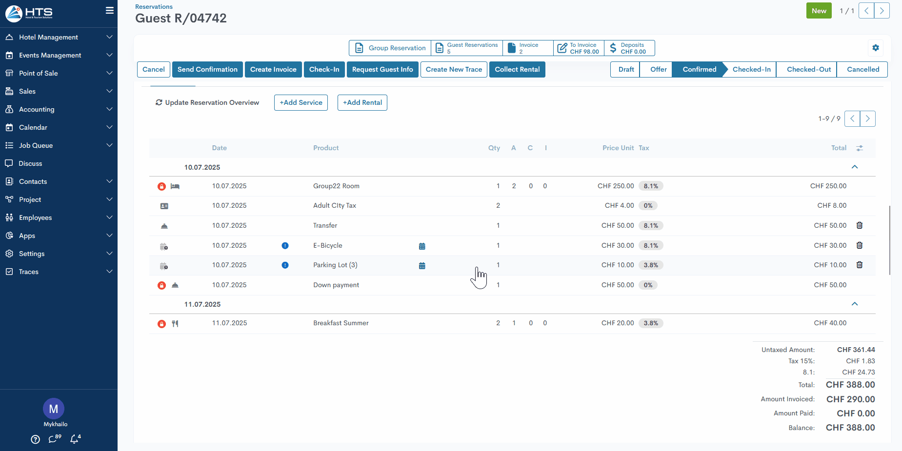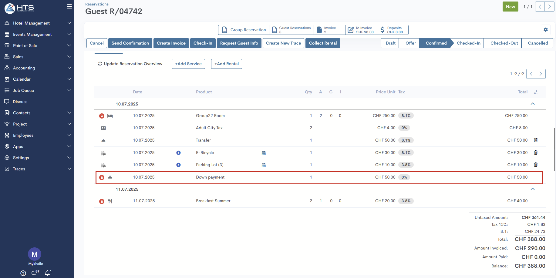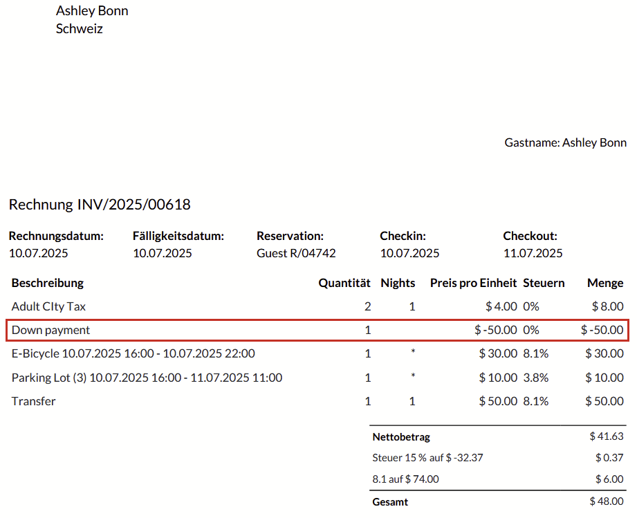 Das System erstellt dann eine Rechnung mit einem Anzahlungsprodukt mit dem berechneten Betrag. Diese Rechnung kann anschließend auf die aktuelle Reservierung angewendet werden.