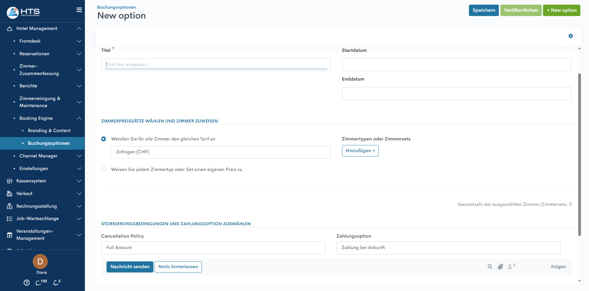 Der vorherige Artikel hat die im Formular für Buchungsoptionen verfügbaren Felder kurz beschrieben — dieser Artikel bietet eine detailliertere Erklärung der einzelnen Funktionen. Beim Klicken auf + Neue Option öffnet das System ein Formular, das drei Bereiche mit entsprechenden Feldern enthält.