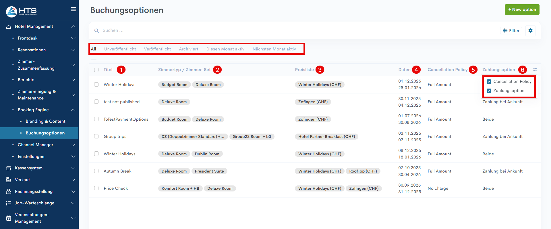 Nachdem die Buchungsoptionen konfiguriert wurden, erscheinen sie beim Öffnen des Menüs Buchungsoptionen in einer Tabelle. Dort werden sie in den folgenden Spalten angezeigt: