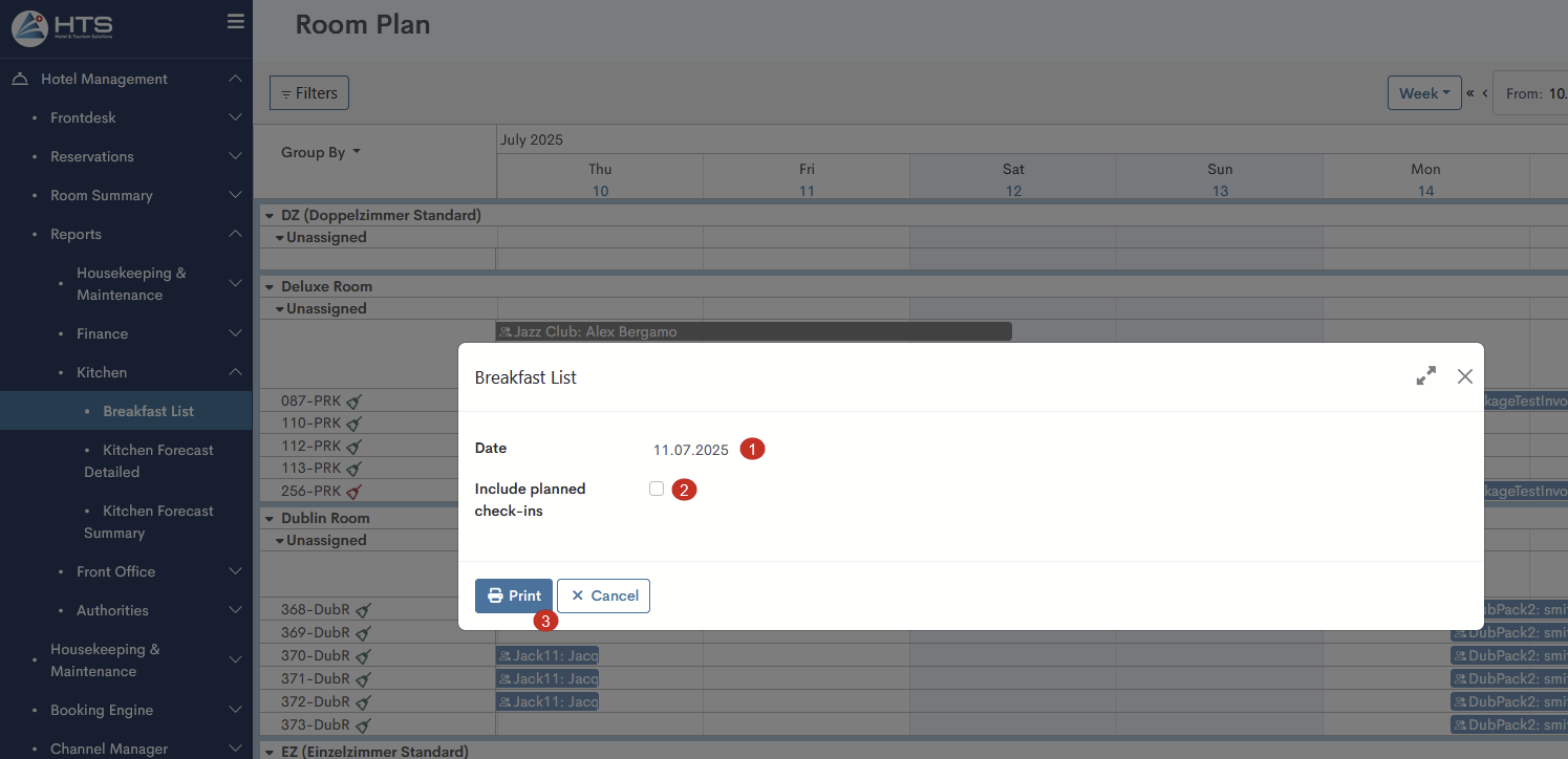 Der Frühstücksbericht ist ein wichtiges Hilfsmittel für das Hotelmanagement, denn er enthält eine umfassende Liste der Gäste, die sich am aktuellen Tag für das Frühstück entschieden haben. Dieser Bericht enthält wichtige Details wie die Namen der Gäste und die entsprechenden Zimmernummern, so dass das Personal die Essensbestellungen effizient verwalten und einen reibungslosen Frühstücksservice gewährleisten kann. Durch die Nachverfolgung der Frühstücksteilnahme kann das Hotel auch die Vorlieben der Gäste einschätzen und das Essensangebot optimieren, um das Gesamterlebnis der Gäste zu verbessern.