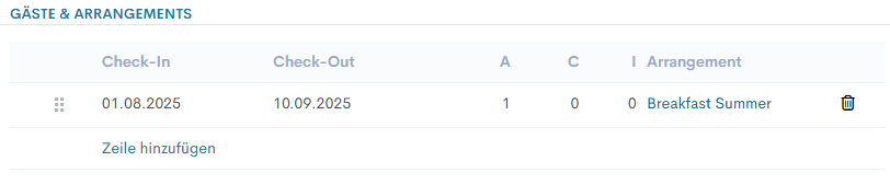 - Arrangement - alle Arrangements, die in allen Zimmerzeilen hinzugefügt sind, werden angezeigt.