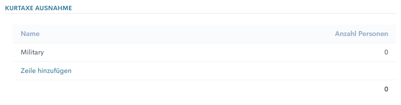Wenn einer der Gäste von der Zahlung der Städtesteuer befreit ist, sollte dies hier angegeben werden. Erstellen Sie dazu eine neue Zeile, wählen Sie im Feld "Name“ den gewünschten Eintrag aus der Liste aus (Militär, Student usw.) und geben Sie im Feld „Personenanzahl“ die Anzahl der Personen an.