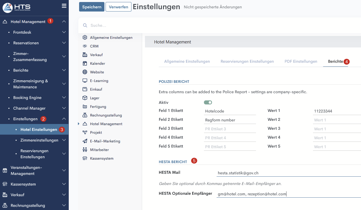 Das System ermöglicht es dem Benutzer, die primäre E-Mail-Adresse der Regierungsbehörde einzugeben, an die der Bericht monatlich gesendet wird, sowie optional eine oder mehrere interne Empfängeradressen zur internen Kontrolle hinzuzufügen. Um dies einzurichten, gehen Sie wie folgt vor: