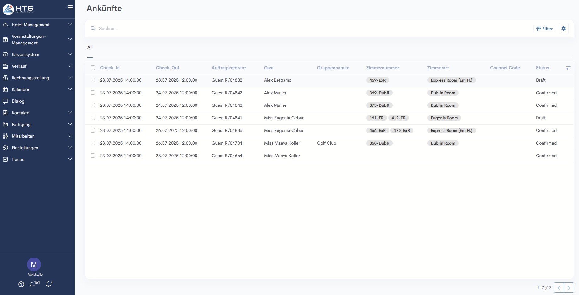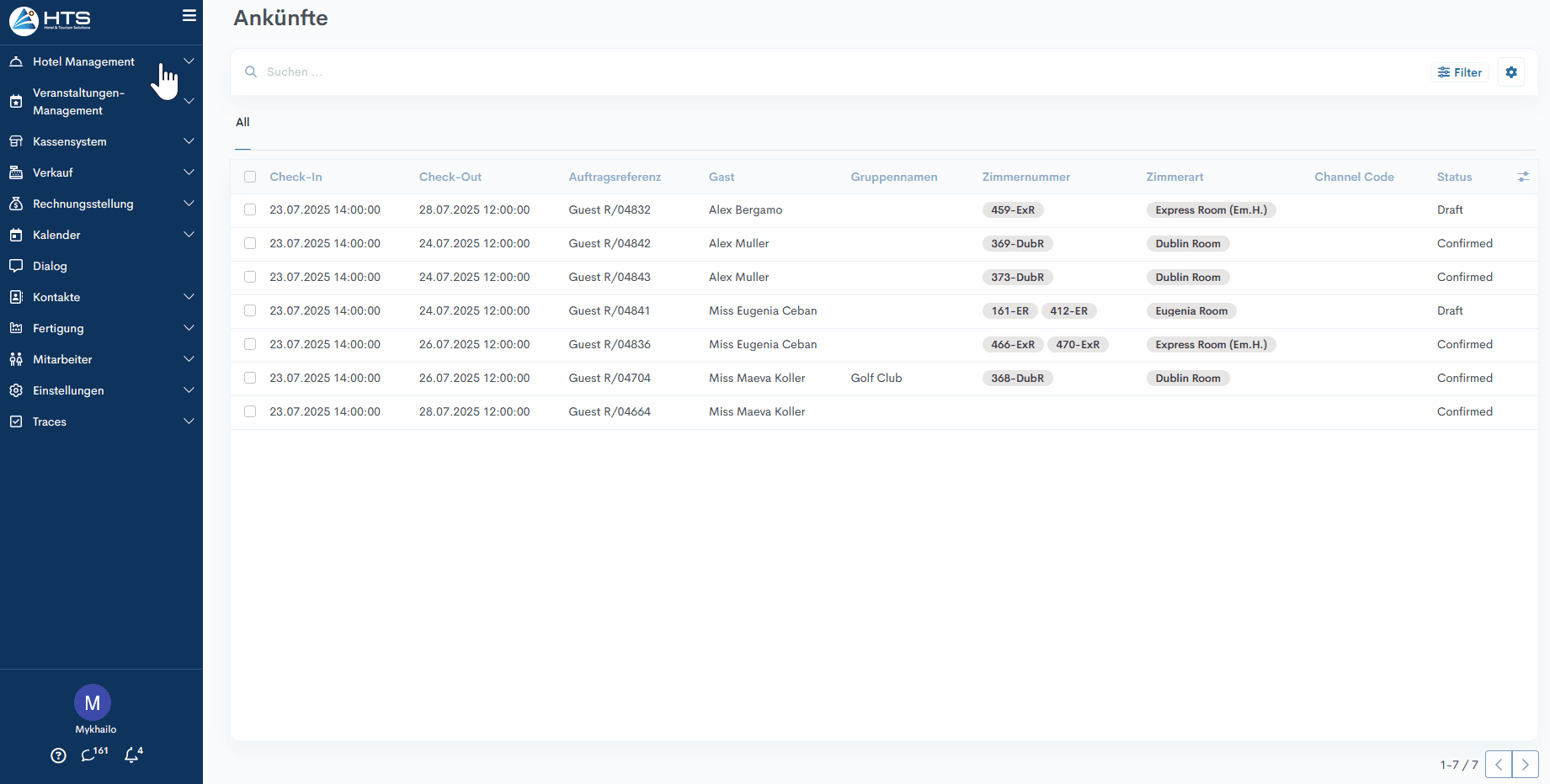 - Durch Klicken auf ein Modul, z. B. „Hotelmanagement“, wird ein Untermenü erweitert, das wiederum weitere Ebenen für eine detailliertere Navigation enthalten kann.