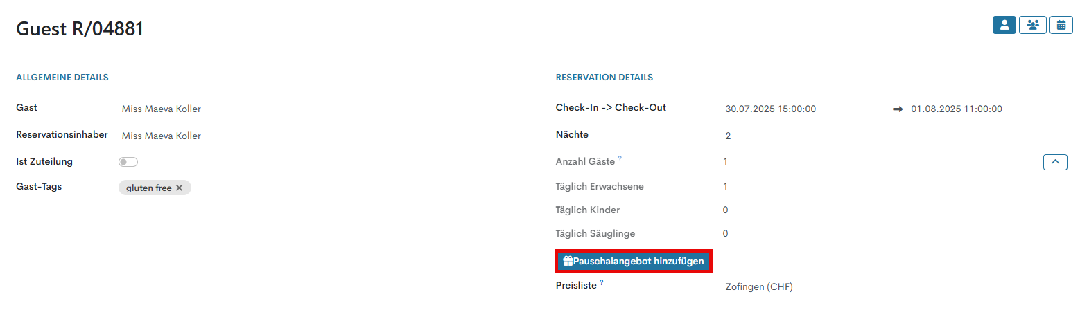 - In der Reservationsmaske in dem "Buchungsdetails"-Abschnitt, klicken Sie auf das Feld "Pauschalangebot hinzufügen";