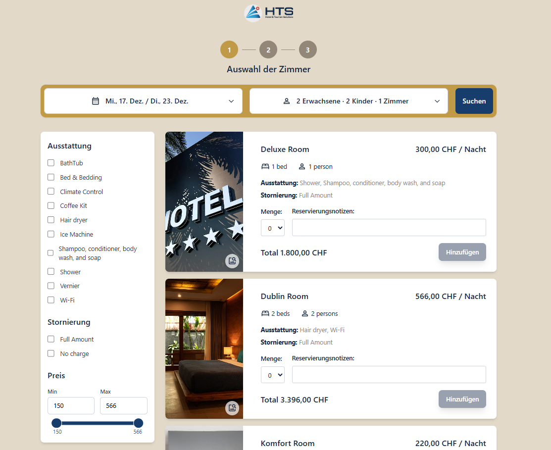 - Zimmerresultate — zeigt die verfügbaren Zimmer für die ausgewählten Daten in einem eleganten Slider-Layout an, mit grossen Fotos, Zimmerbeschreibungen und wichtigen Details wie Kapazität, Ausstattung und Preisangaben.