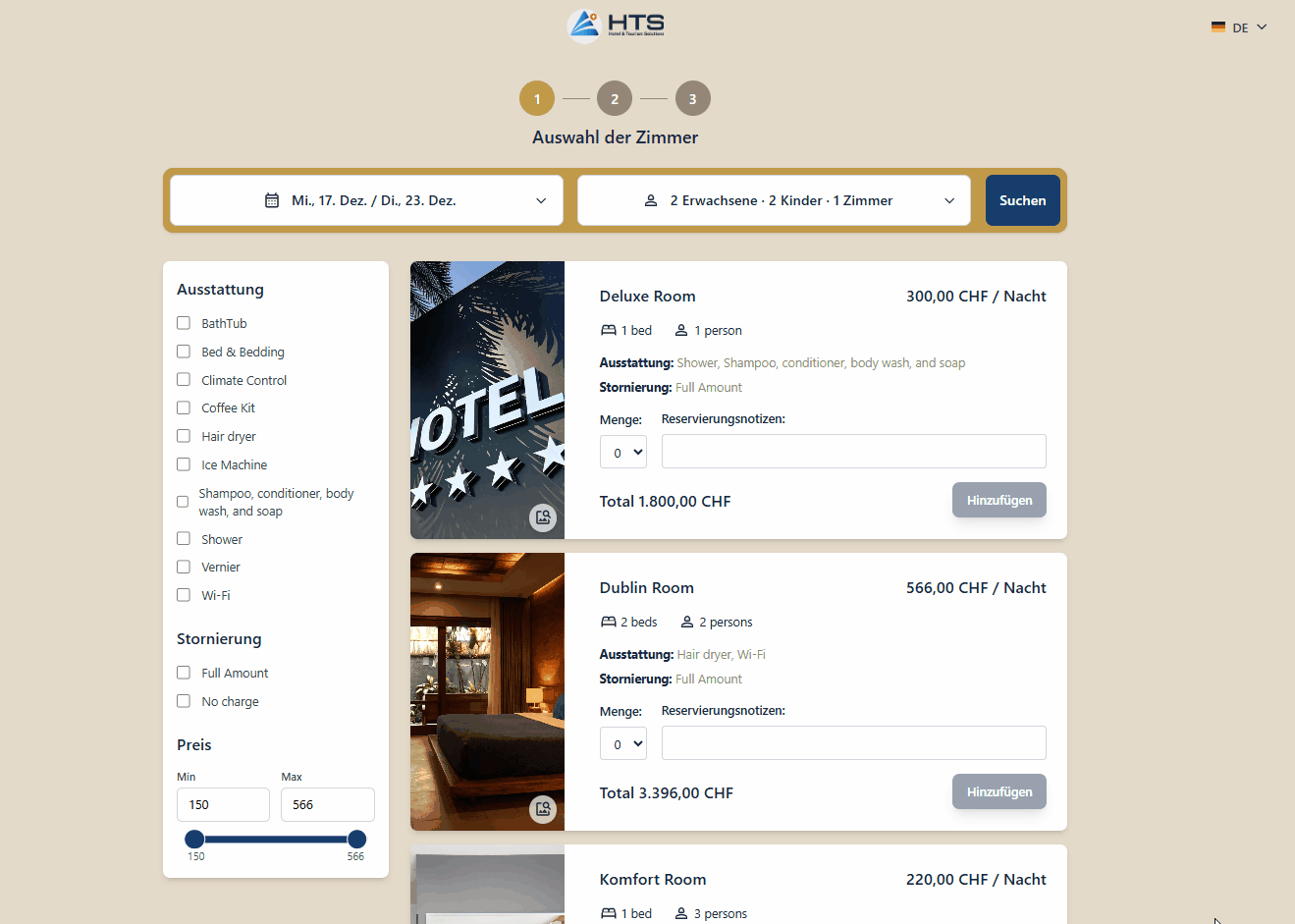 Nach der Auswahl der Aufenthaltsdaten, der Anzahl der Gäste (einschliesslich Erwachsene und Kinder mit ihrem Alter) sowie der Anzahl der Zimmer führt ein Klick auf die Schaltfläche Suchen den Gast zum nächsten Schritt — der Zimmerauswahl.