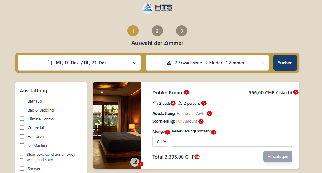 Die Zimmerkarte ist so gestaltet, dass sie Gästen eine klare und ansprechende Übersicht über jedes verfügbare Zimmer bietet. Sie enthält folgende Elemente: