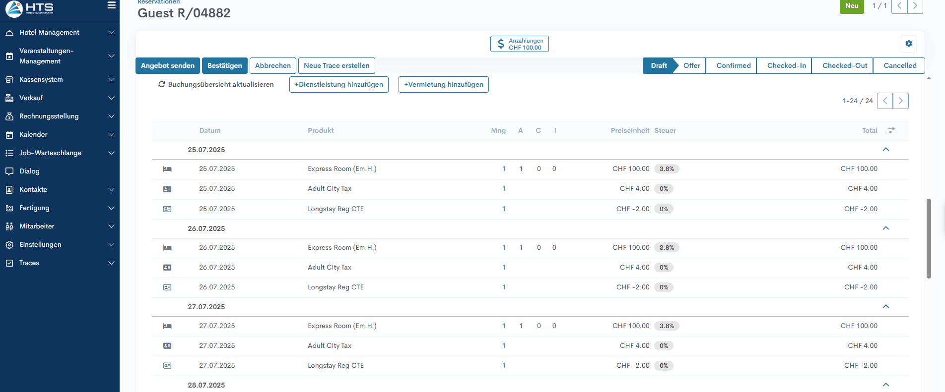 Wenn beim Anlegen einer Reservation (vorausgesetzt, diese Einstellung ist aktiviert und ein Ausnahmeprodukt für Langzeitaufenthalte ist im System verfügbar) die Dauer einer solchen Reservation gleich oder länger als der in der Einstellung angegebene Wert ist, fügt das System automatisch das Ausnahmeprodukt zur Reservationsübersicht hinzu und reduziert damit die Kosten der Städtesteuer für den Gast.