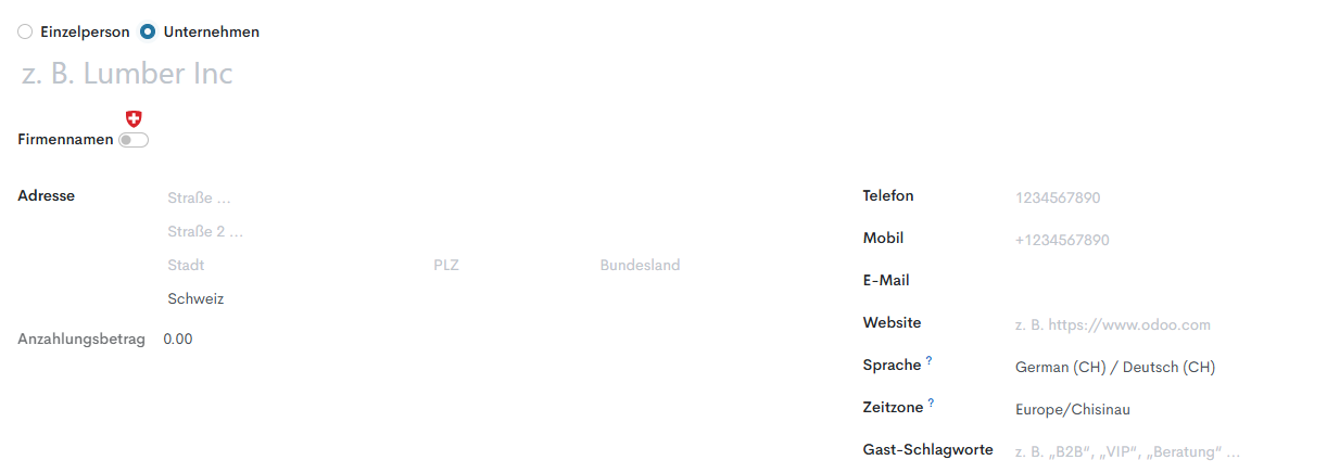 Odoo erlaubt die Erstellung zweier verschiedener Kontaktarten - Einzel und Firma. Um einen Einzel Kontakt zu erstellen, sollte ein User die folgenden Informationen angeben: