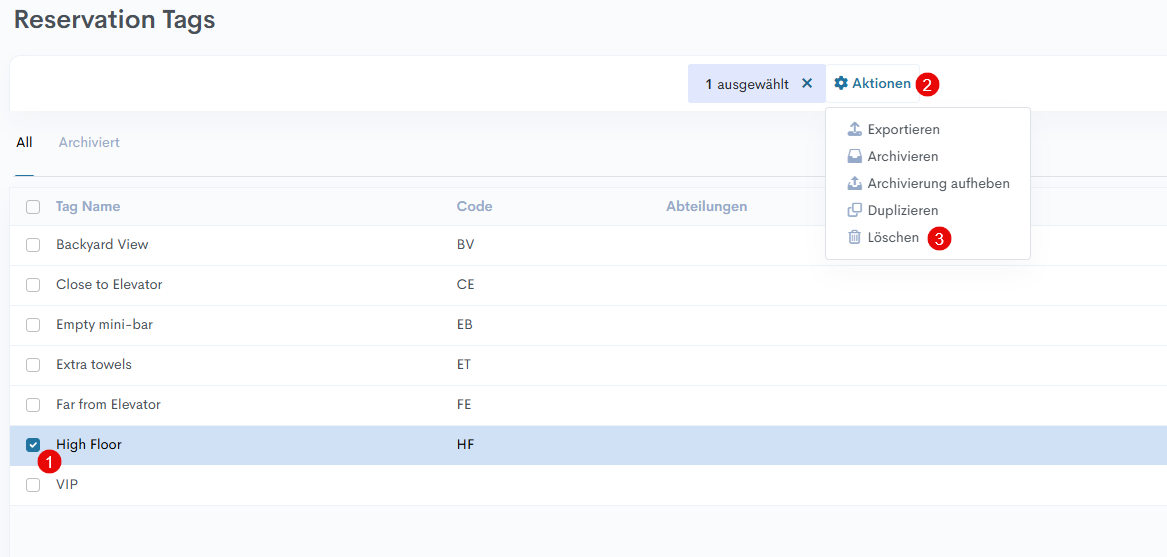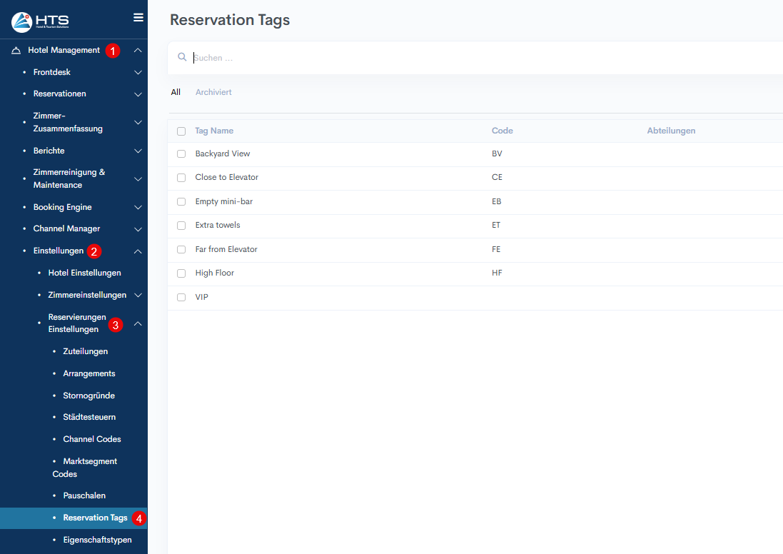For Beispiel: Wenn das Schlagwort „extra Handtuch“ mit der Abteilung „Housekeeping“ zur Reservation hinzugefügt wird, wird es im HSK-Bericht angezeigt.