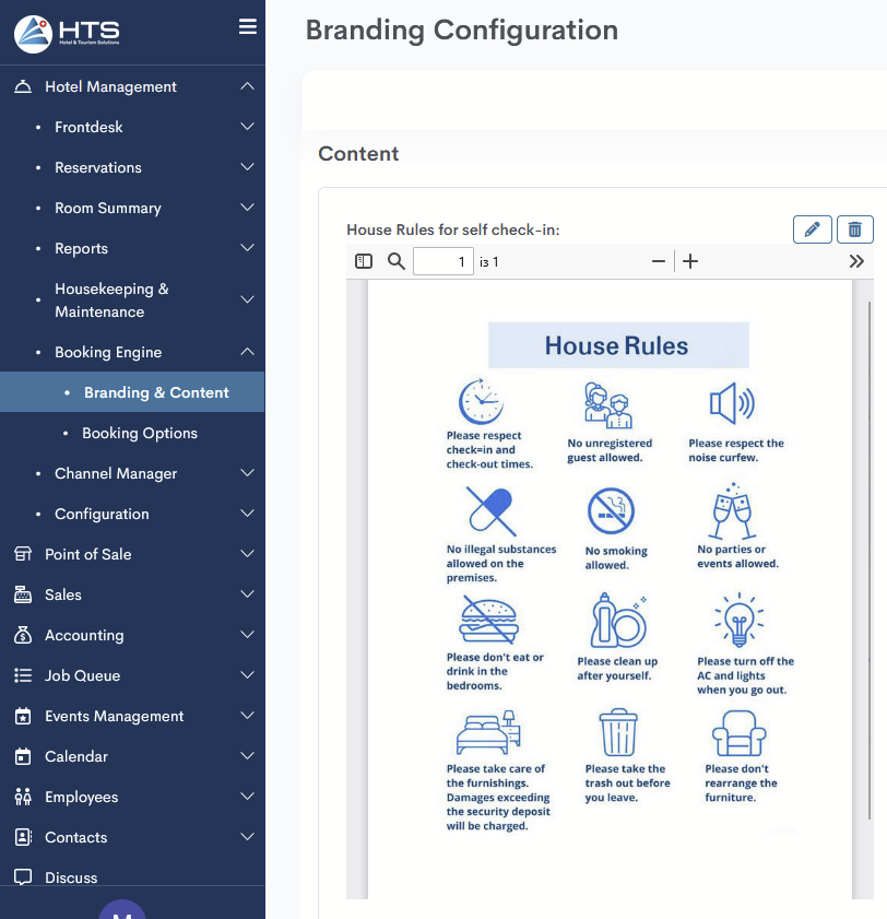 An important step of the self check-in process is the guest’s review of the hotel’s house rules, which cover topics such as check-in and check-out times, smoking policy, and other guidelines. The system allows users to upload a PDF file in the backend setup so that these rules are displayed to the guest. To add this file, follow the steps below: