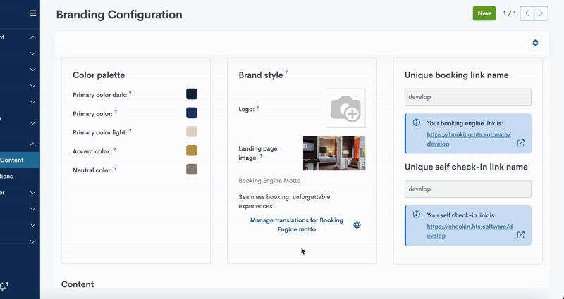 The main points regarding the backend setup for self check-in can be found in the Branding & Content section of the Booking Engine menu. To do this, open the Hotel Management module and navigate to the Branding&Content section under the Booking Engine menu.
