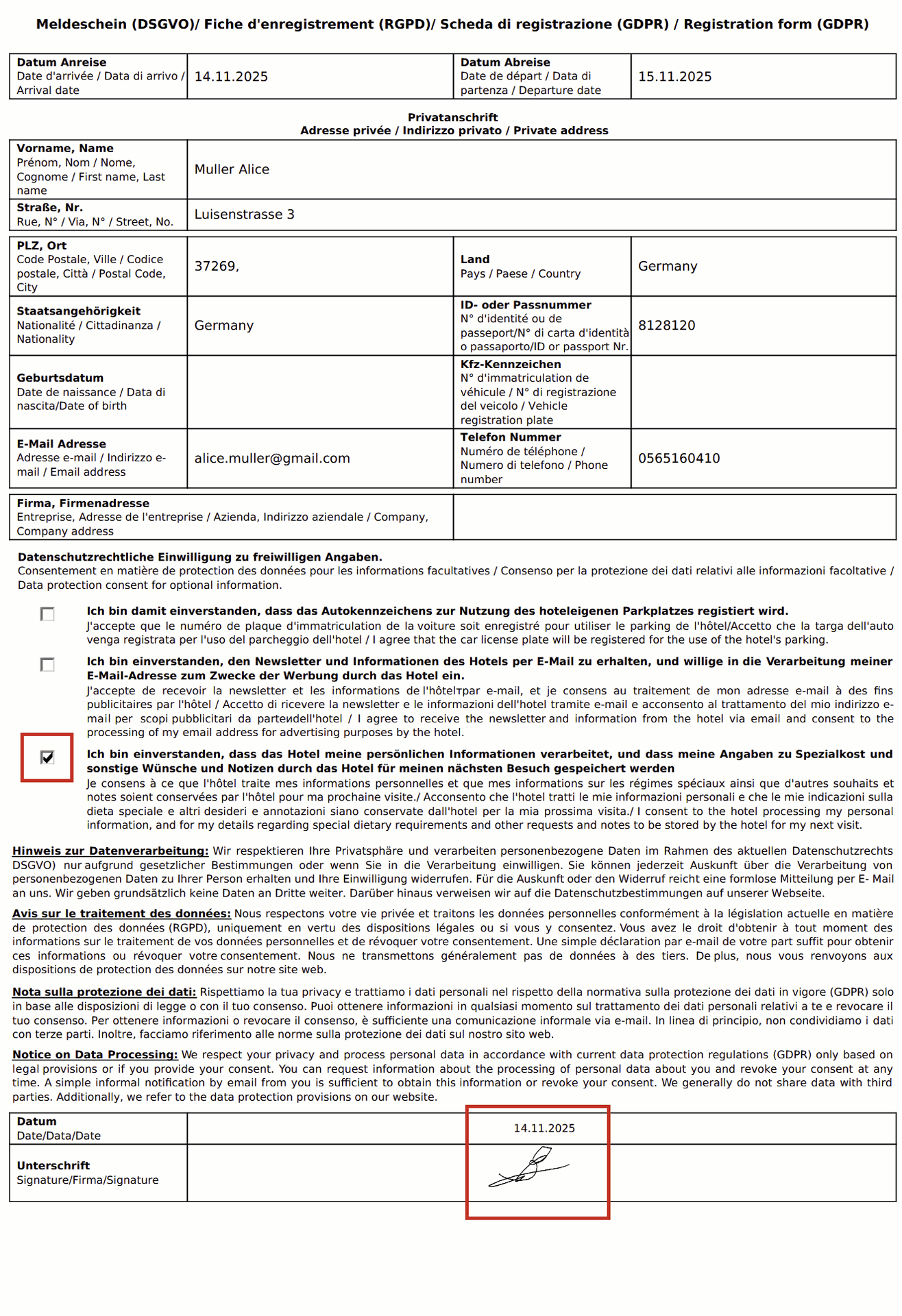 Beim Drucken des Register of Arrival setzt das System automatisch das Häkchen für die Einwilligung, trägt das Check-in-Datum ein und zeigt die Unterschrift des Gastes im unteren Abschnitt an.