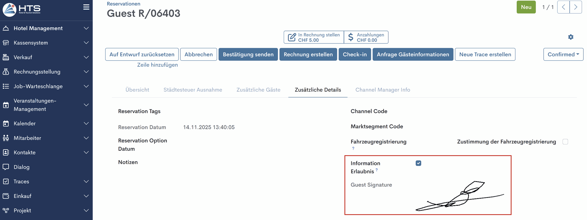In der Registerkarte Additional Details aktiviert das System nach Abschluss des Self-Check-ins das Kontrollkästchen Information Consent und fügt ein schreibgeschütztes Feld Signature hinzu, in dem die Unterschrift des Gastes gespeichert wird.