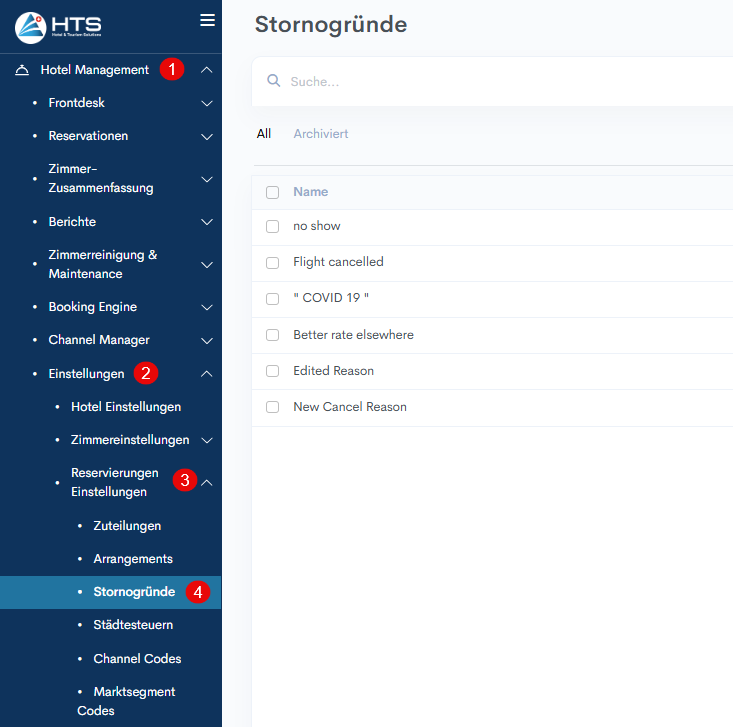 Diese Phase des Anlegens von Stornierungsgründen ist der erste Schritt zur Umsetzung des korrekten Stornierungsprozesses in Ihrem Hotel. Dieser Prozess wird in den folgenden Artikeln ausführlicher beschrieben - So stornieren Sie einzelne Reservationen und so stornieren Sie eine Gruppenreservation.
