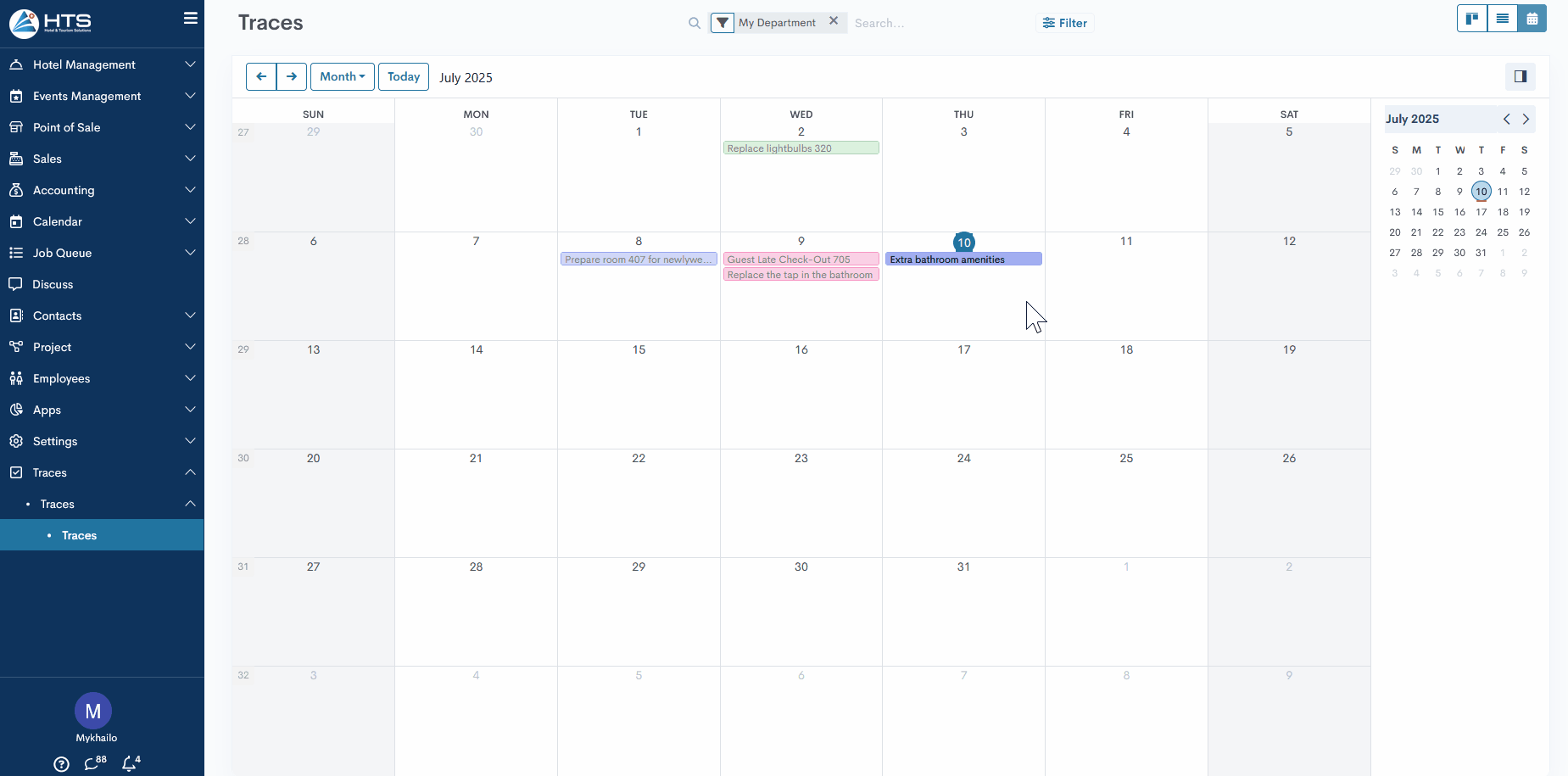 When opening Traces in the Calendar view, users are presented with a calendar of the current month displaying all relevant traces as colored bars on their respective due dates. Just like in Kanban and List views, the default filter My Department is applied to show only traces related to the user’s department.
