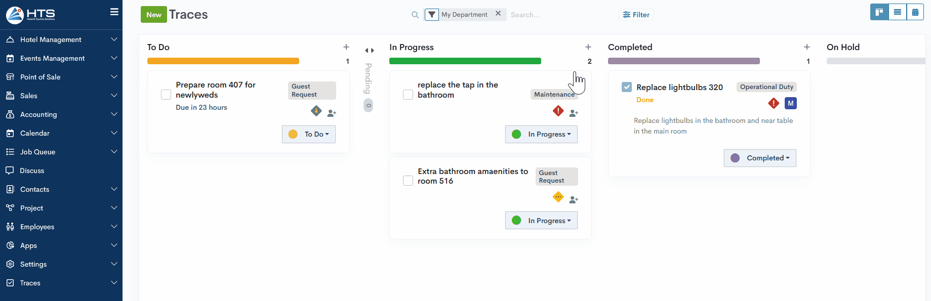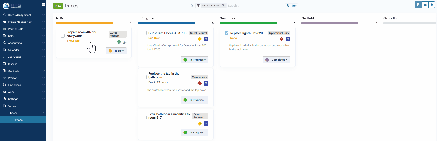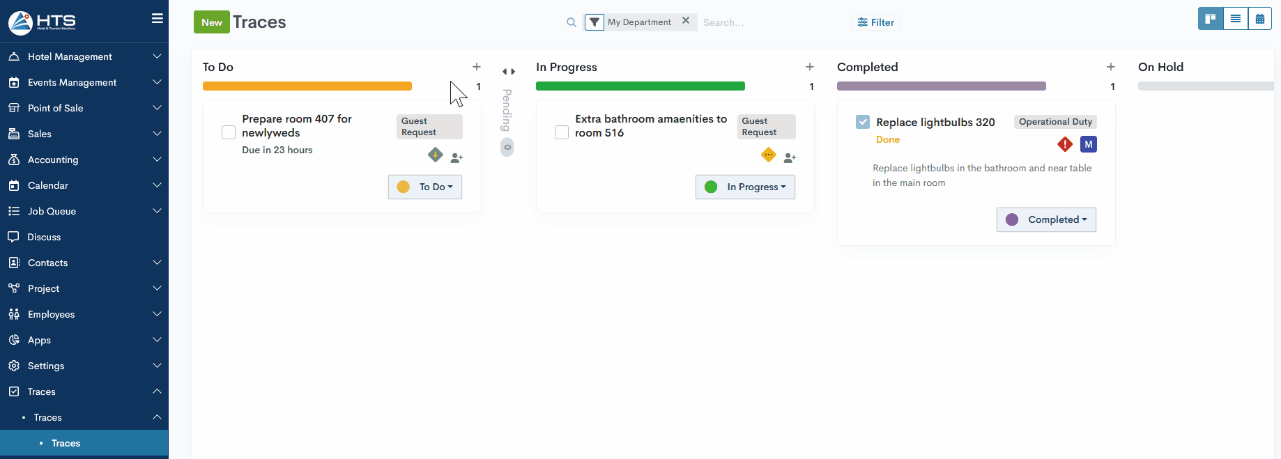 A default filter called “My Department” is applied, showing only the Traces that belong to the same department as the logged-in user. This helps users focus only on what is relevant to their team. If the default filter is removed, all available traces will be displayed on the board.