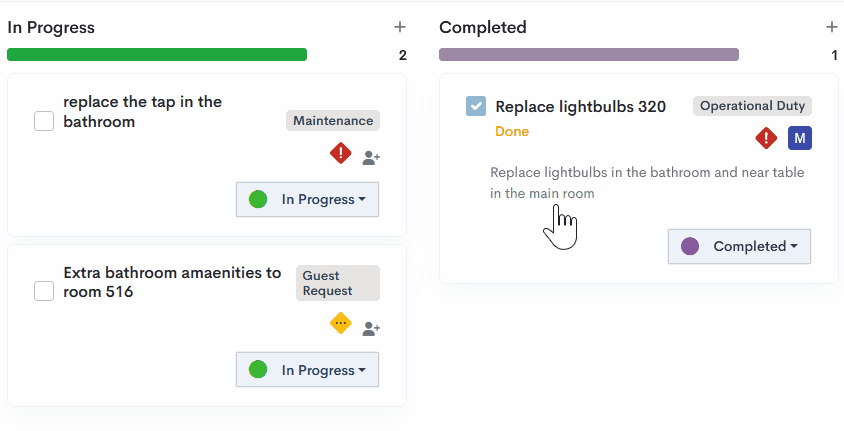 - Category (for example, Operational Duty, Maintenance, Guest Request)