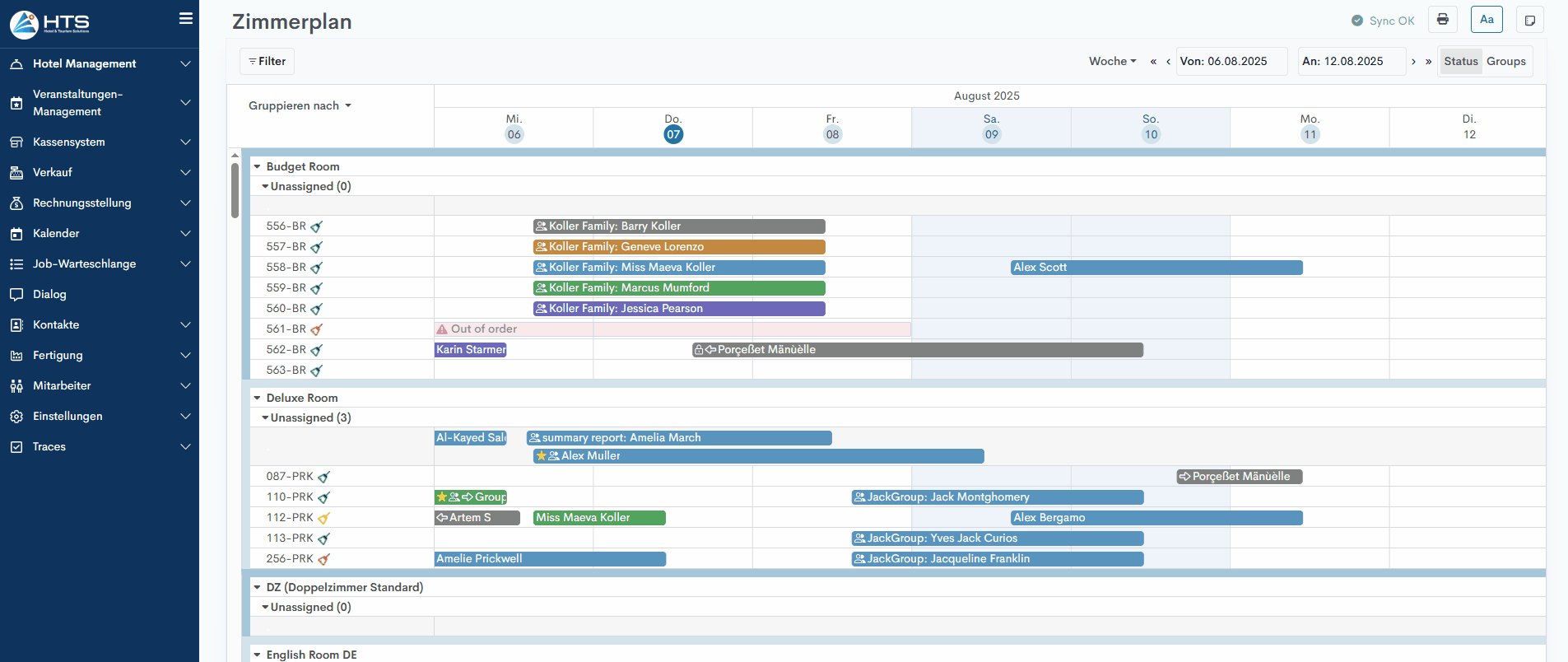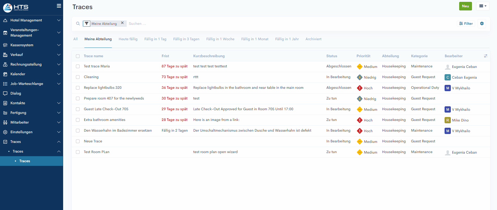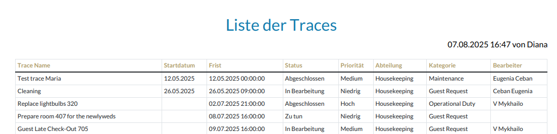 In der Traces-Listenansicht ermöglicht das System bei Auswahl mehrerer Traces den Druck einer Liste von Traces. Der Ausdruck enthält dieselben Spalten wie in der Tabelle angezeigt (z. B. Trace-Name, Status, Fälligkeitsdatum usw.). Zusätzlich enthält die Liste das Druckdatum und die Uhrzeit oben sowie die Kontaktdaten des Hotels am unteren Seitenrand.