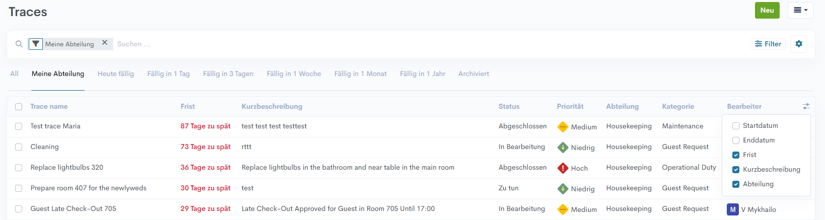 - Meine Abteilung (standardmäßig aktiviert, zeigt nur Traces, die der Abteilung des Benutzers zugewiesen sind)