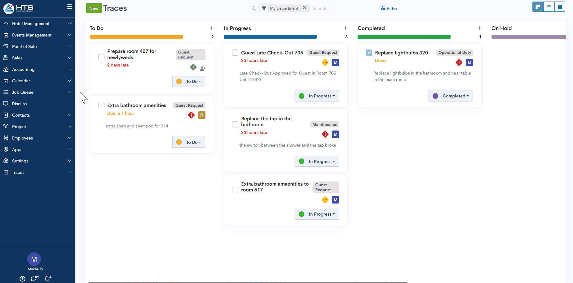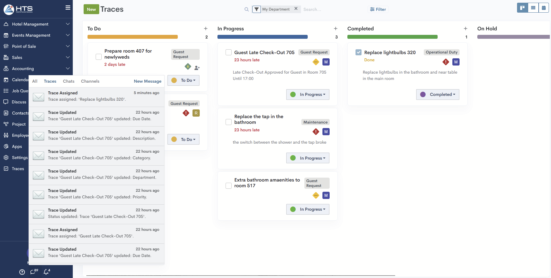 The system sends notifications when a trace is assigned to a user, as well as when its status, department, category, description, or priority is changed. In the notification list, the time each notification was received is also displayed, helping users track recent updates effectively.