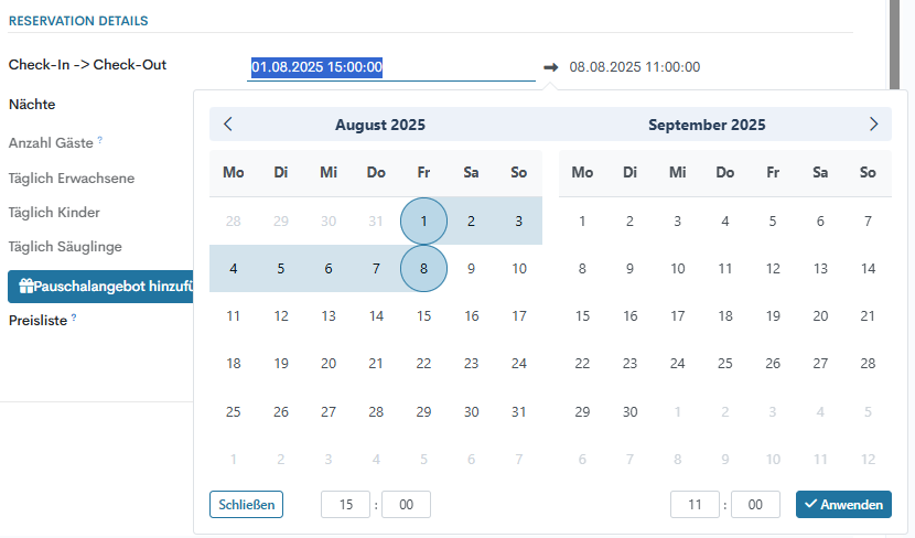 - 'Check-In -> Check-Out' - die Werte in diesen Feldern werden automatisch mit den Daten des "Check-In & Check-Out" Feldes aus dem Buchungsdetails Abschnitt ausgefüllt;