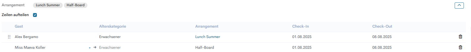 Dieser Ansatz wird für Reservierungen benötigt, bei denen die Gäste während ihres Aufenthalts unterschiedliche Arrangements haben. Sobald das Kontrollkästchen "Split Lines" aktiviert ist, erscheint die folgende Tabelle: