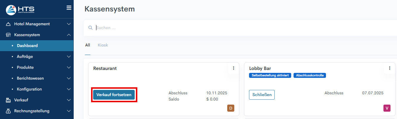 Wählen Sie dort das Kassensystem aus, in dem die vorherige Konfiguration vorgenommen wurde, und klicken Sie entweder auf «Verkauf fortsetzen», wenn bereits eine Sitzung geöffnet ist, oder auf «Neue Sitzung», um eine neue zu starten.