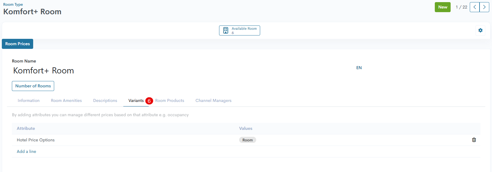 In dieser Registerkarte ist ein Standardprodukt verfügbar - eine Zimmerart mit allen Preisoptionen aus der Registerkarte „Varianten“. Um einige neue Produkte hinzuzufügen, gehen Sie wie folgt vor: