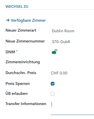 - Transferdatum & zeit – Legen Sie Datum und Uhrzeit fest, zu denen der Gast in ein anderes Zimmer umzieht.